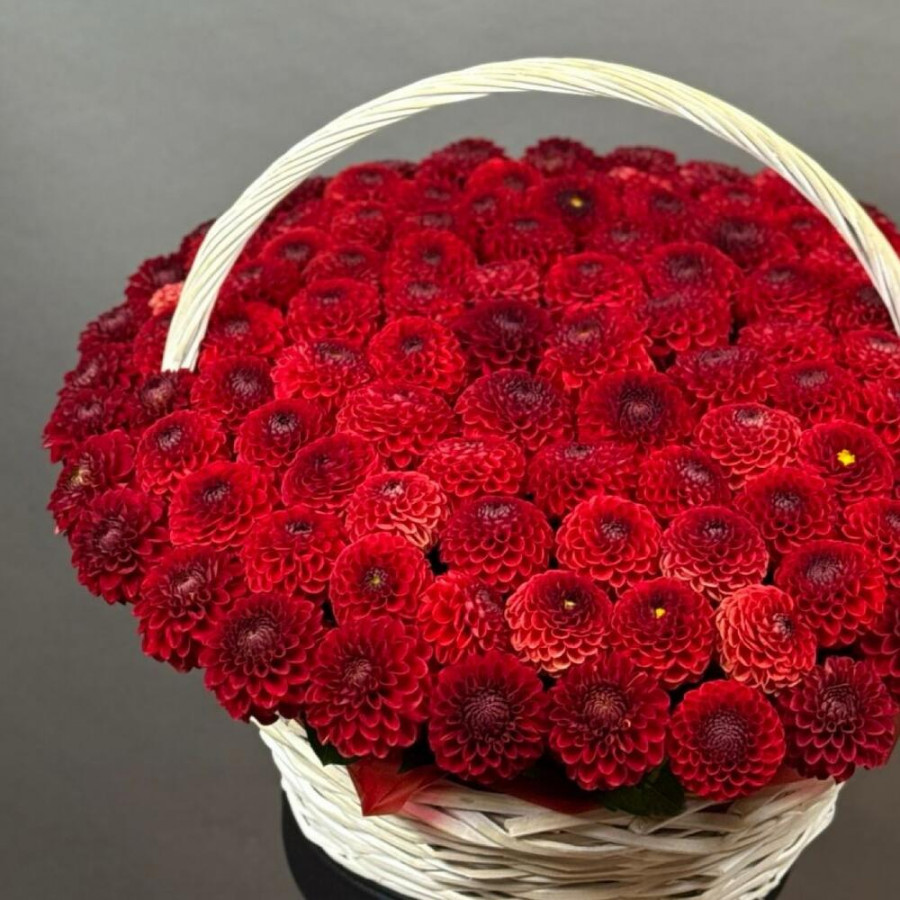 На фото композиция из 101 красной георгины в корзине. В составе: георгина 101 шт, оазис флористический 7 шт, корзина (xl) 1 шт, атласная лента 2 шт, . Все цветы свежие и ароматные, букет красиво оформлен и отлично подходит для подарка. Доступна доставка цветов или самовывоз.