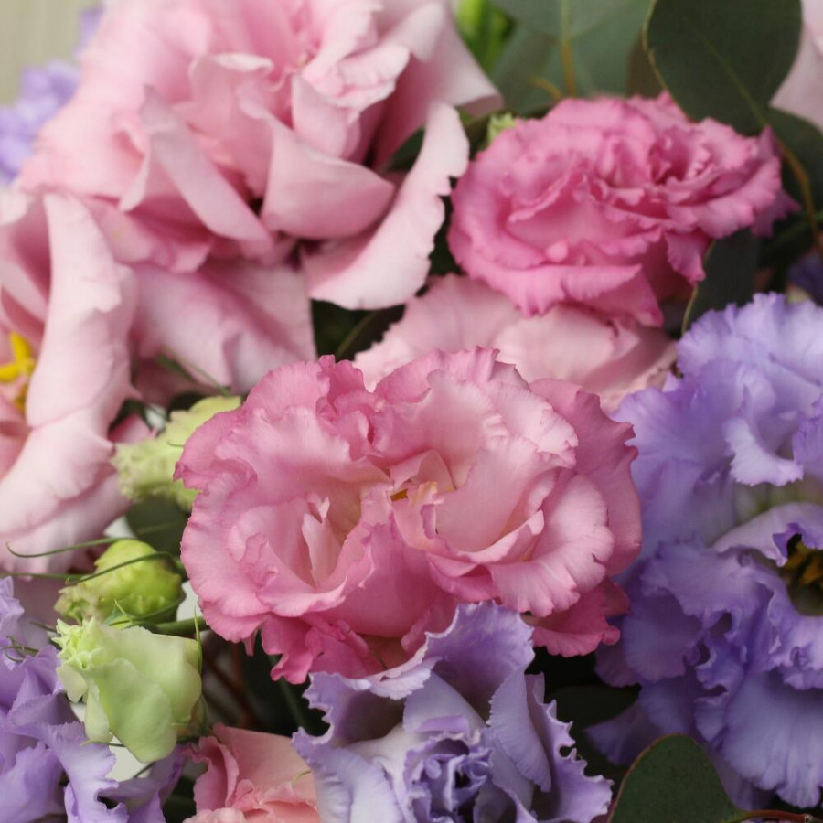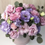 Букет из 15 розовых и сиреневых эустом в коробке в Долгопрудном